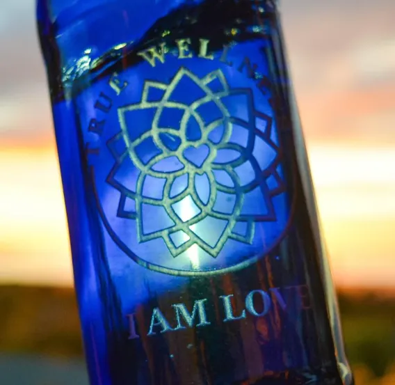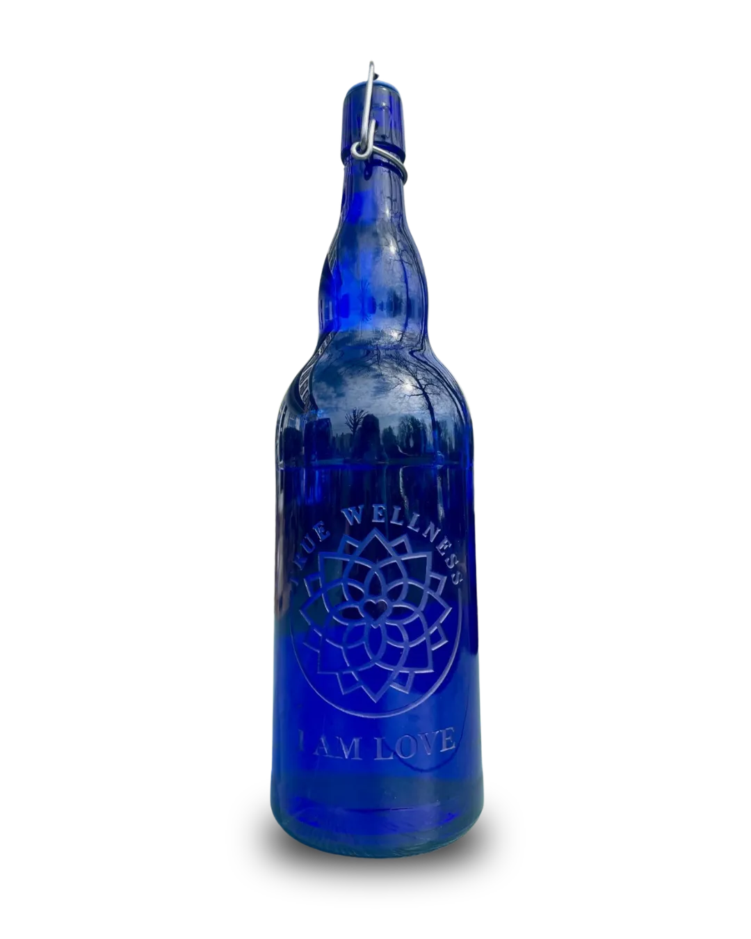 True Wellness Blue Bottle: Structures water, holds frequency, supports drainage, detoxification, cellular energy, and whole-body harmony.